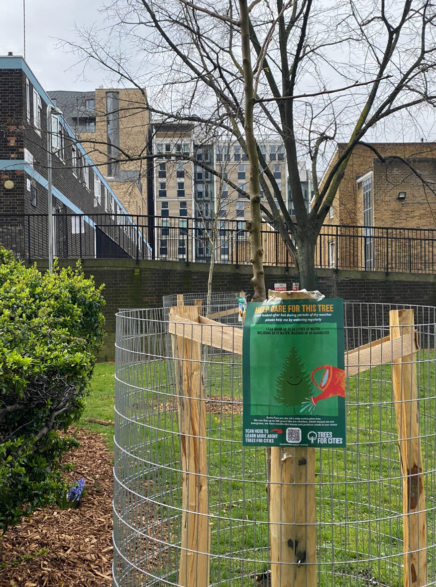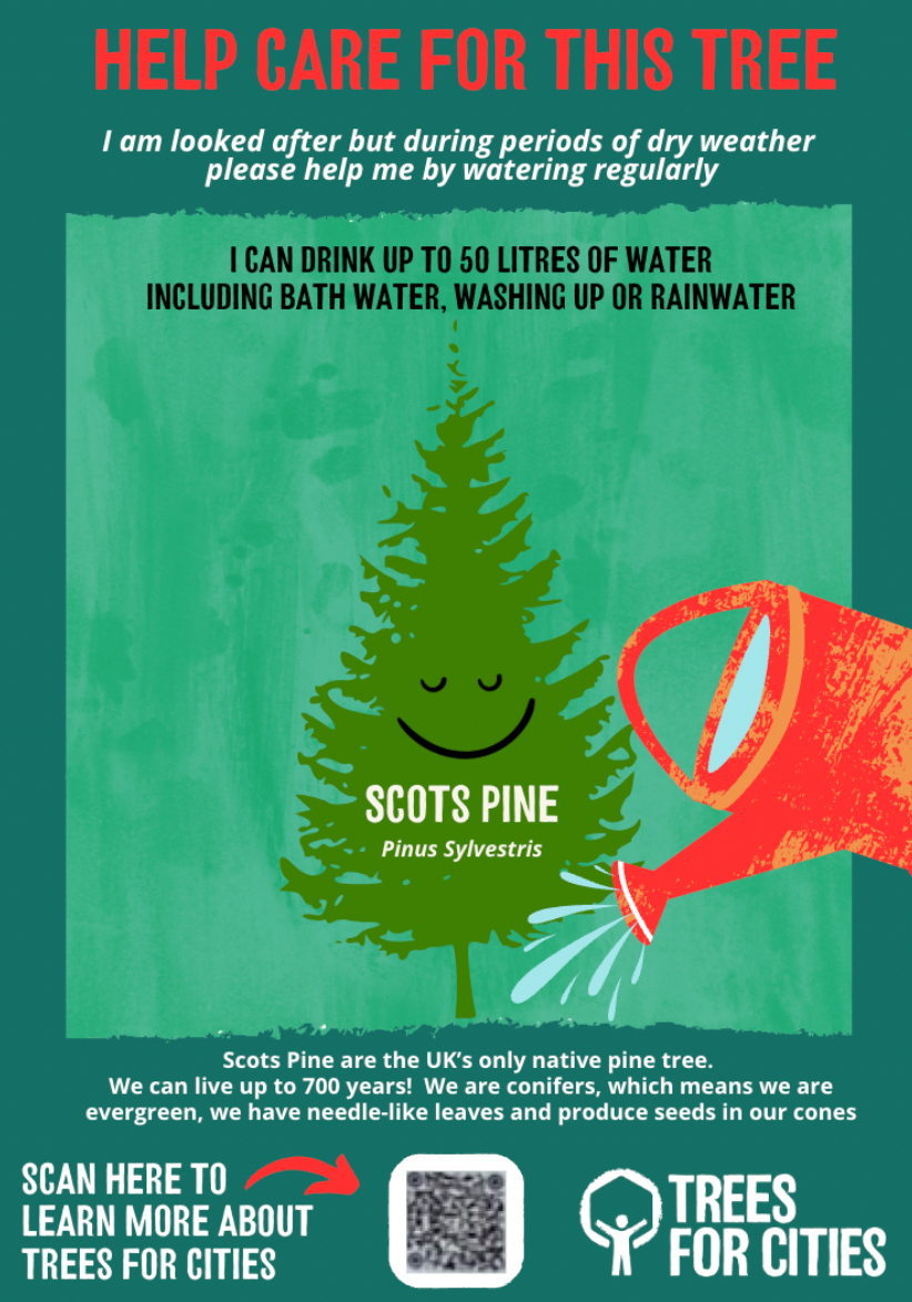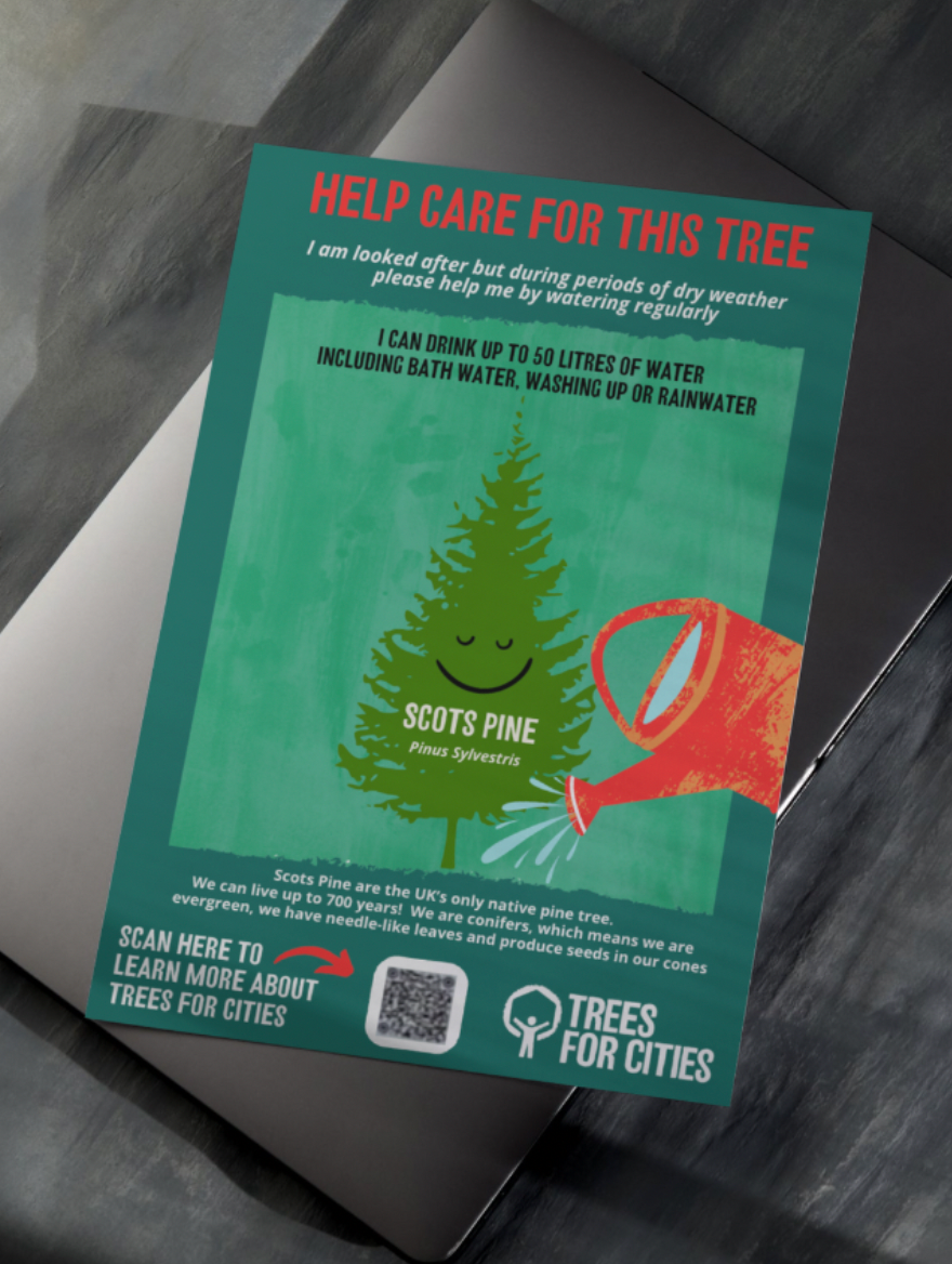 Posters were displayed around saplings to raise awareness and includes a QR code with a link to additional learning.