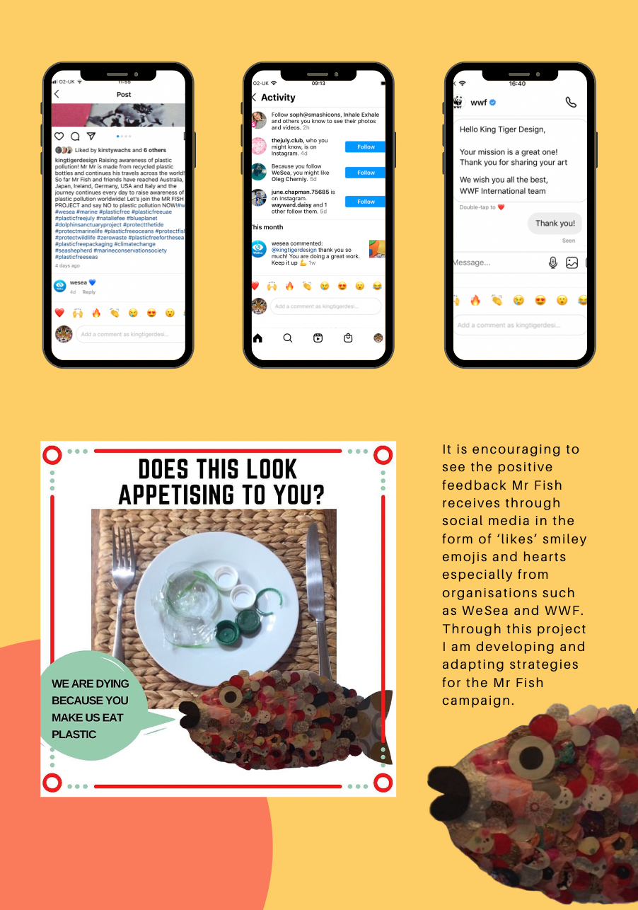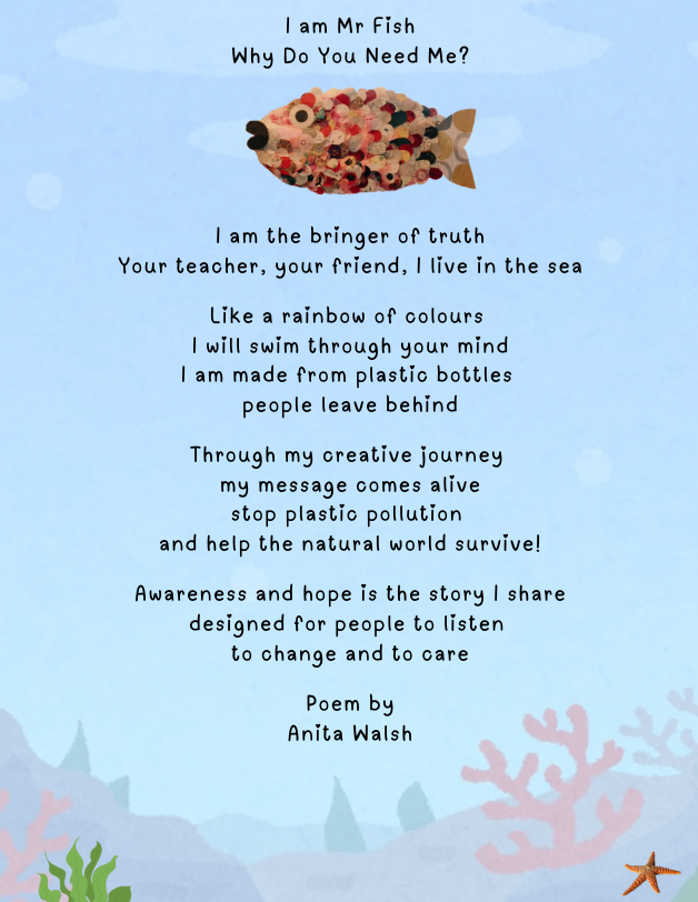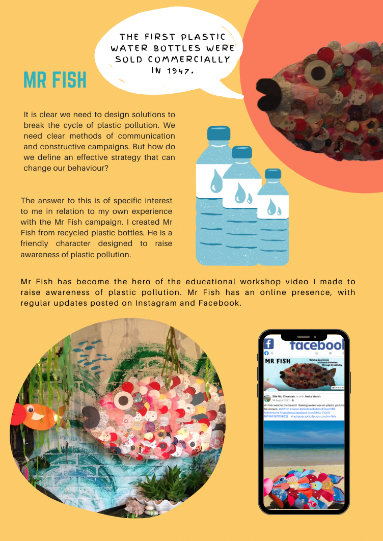 While studying my Masters Degree in graphic design I started my own campaign to raise awareness of plastic pollution. I created Mr Fish from recycled plastic and paper.